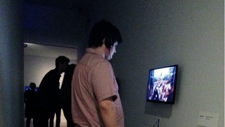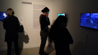 I’m not sure if this part of the exhibit was always so dim, allowing, I imagine, the vids themselves to look vibrant, or if it was lit that way only for the opening reception. A few people did lean forward to squint at the curators’ cards. Anyway, that’s why the pictures are kind of crappy.