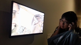 I haunted the vidding area for probably 45-60 minutes on and off over the course of the evening to see how people behaved when they came over. Reactions seemed to run the gamut: Some kept walking, some glanced at a screen or two and continued on, some read the vidding description with interest, some watched whole or parts of vids without audio, some put on the headphones and did the same, some shared or tried to share the headphones with whomever they were with (some partners accepted and others refused), a few went from screen to screen and watched at least part of each in turn.